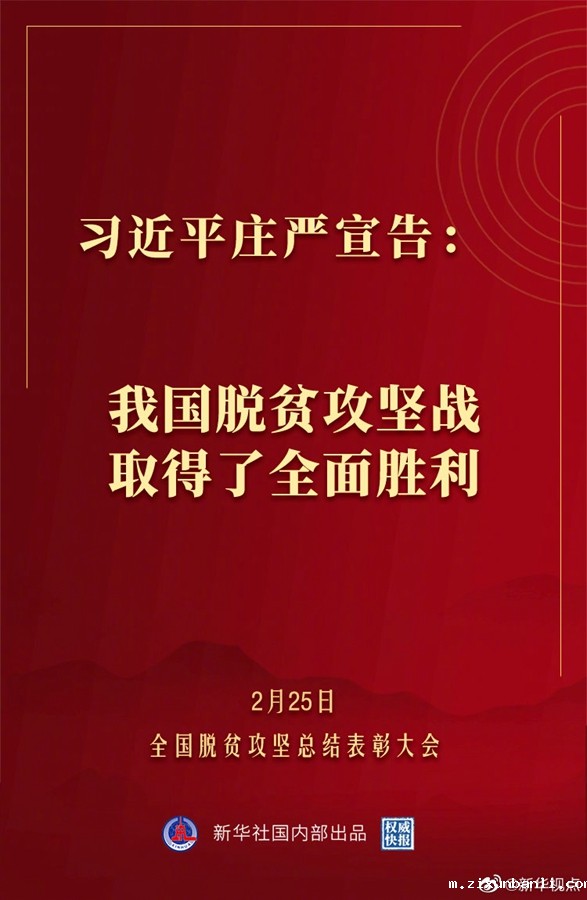 习近平在全国脱贫攻坚总结表彰大会上发表重要讲话,庄严宣告,经过全党全国各族人民共同努力,在迎来中国共产党成立一百周年的重要时刻,我国脱贫攻坚战取得了全面胜利,现行标准下9899万农村贫困人口全部脱贫,832个贫困县全部摘帽,12.8万个贫困村全部出列,区域性整体贫困得到解决,完成了消除绝对贫困的艰巨任务,创造了又一个彪炳史册的人间奇迹!这是中国人民的伟大光荣,是中国共产党的伟大光荣,是中华民族的伟大光荣!