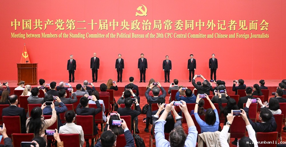 10月23日,刚刚在中国共产党第二十届中央委员会第一次全体会议上当选的中共中央总书记习近平和中共中央政治局常委李强、赵乐际、王沪宁、蔡奇、丁薛祥、李希在北京人民大会堂同采访中共二十大的中外记者亲切见面。新华社记者 申宏 摄