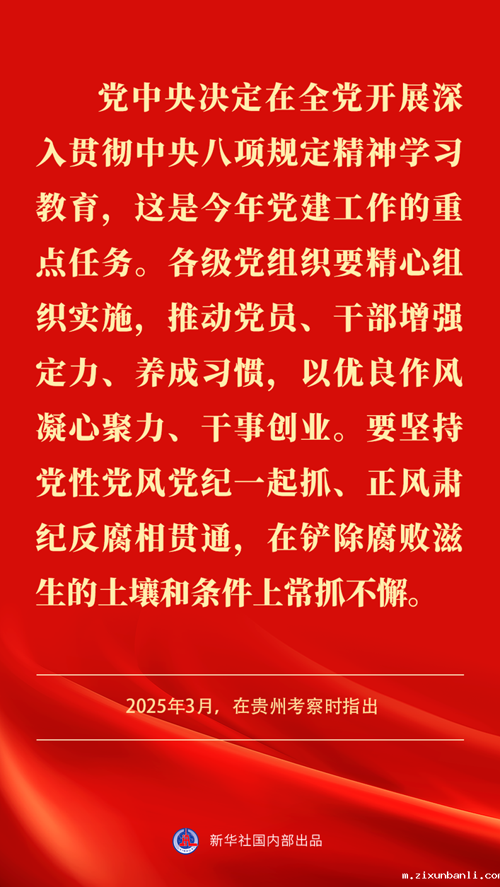 中央党的建设工作领导小组近日召开会议指出,党中央决定,自2025年全国两会后至7月在全党开展深入贯彻中央八项规定精神学习教育。