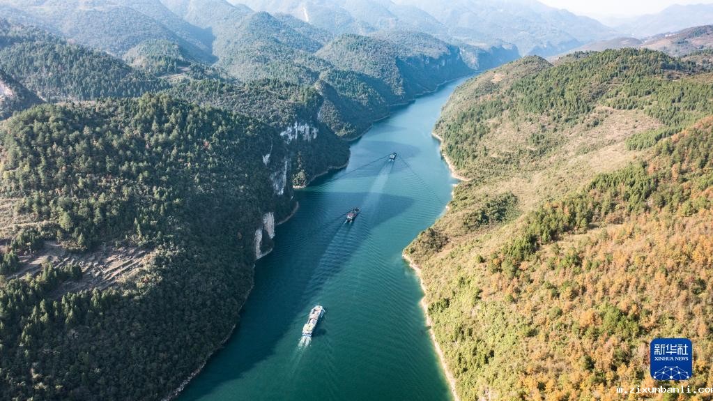 运载磷矿石的货船沿乌江航道顺流航行(2021年11月18日摄,无人机照片)。 新华社记者 陶亮 摄