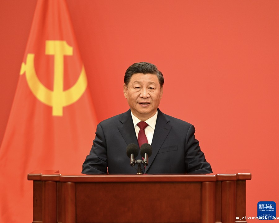 10月23日,刚刚在中国共产党第二十届中央委员会第一次全体会议上当选的中共中央总书记习近平和中共中央政治局常委李强、赵乐际、王沪宁、蔡奇、丁薛祥、李希在北京人民大会堂同中外记者亲切见面。这是习近平发表重要讲话。 新华社记者 李学仁 摄