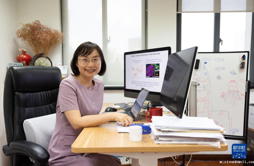 陈玲玲在中国科学院分子细胞科学卓越创新中心办公室留影,右侧是她女儿的画作(2022年8月11日摄)。新华社记者 金立旺 摄