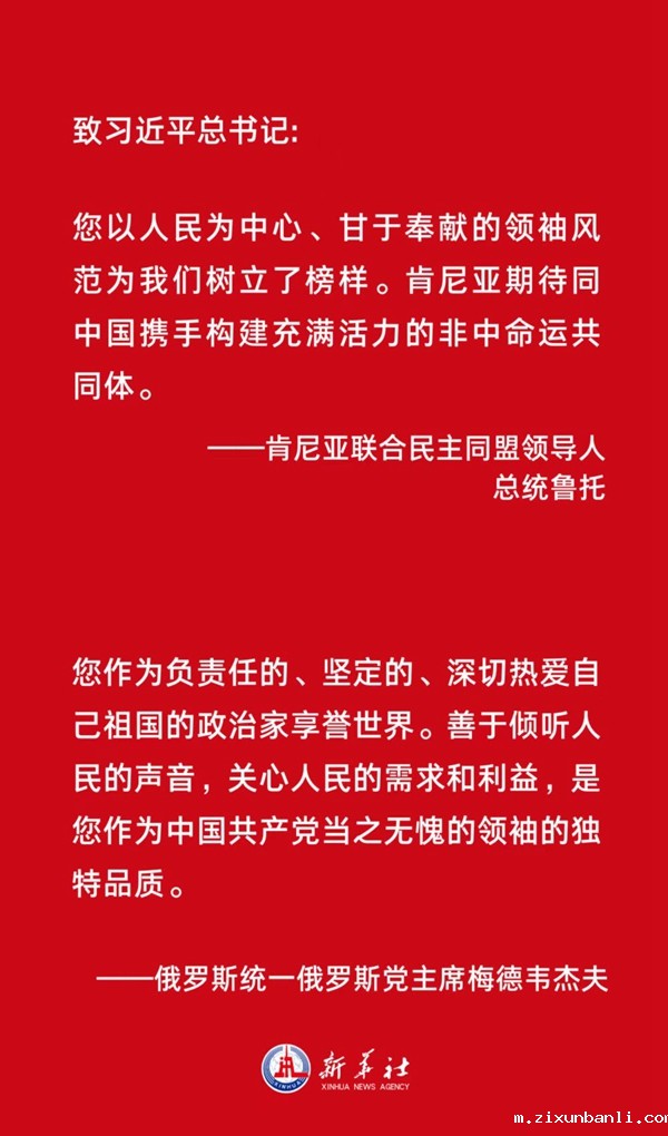 俄罗斯统一俄罗斯党主席梅德韦杰夫表示,您作为负责任的、坚定的、深切热爱自己祖国的政治家享誉世界。善于倾听人民的声音,关心人民的需求和利益,是您作为中国共产党当之无愧的领袖的独特品质。