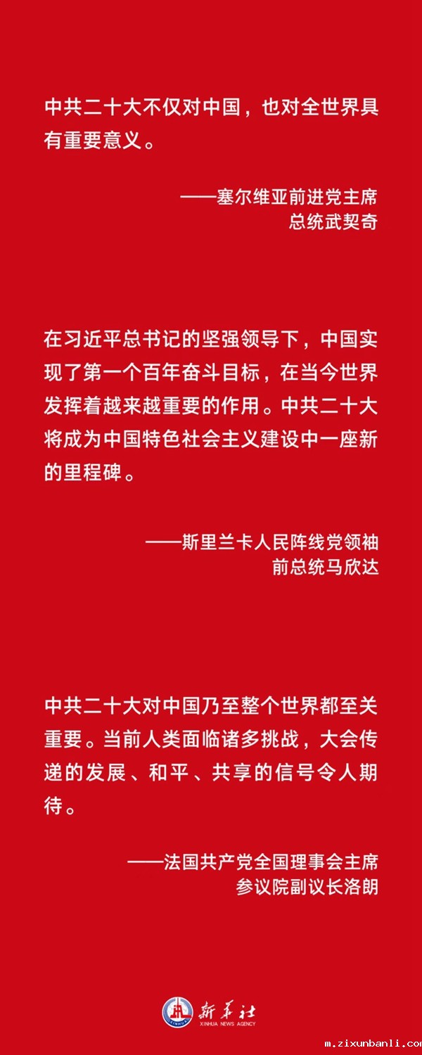 斯里兰卡人民阵线党领袖、前总统马欣达表示,在习近平总书记的坚强领导下,中国实现了第一个百年奋斗目标,在当今世界发挥着越来越重要的作用。中共二十大将成为中国特色社会主义建设中一座新的里程碑。