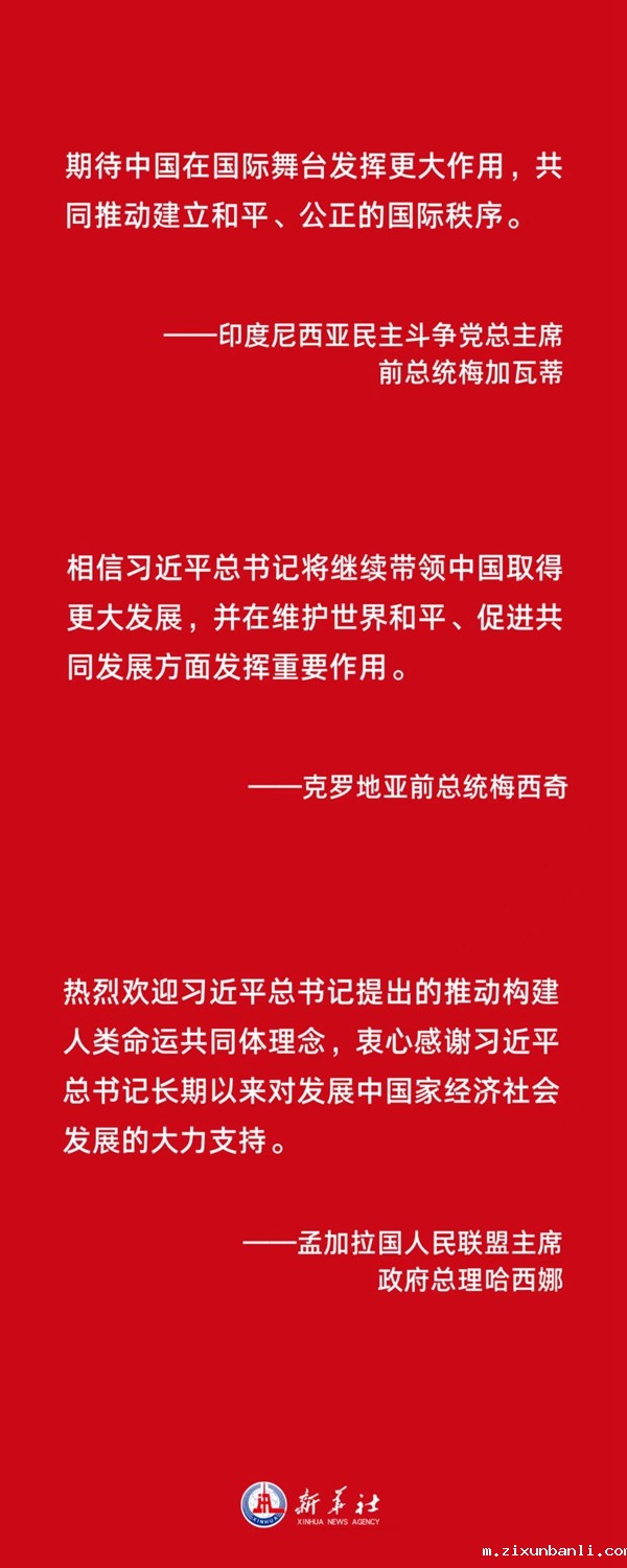 这是党心所向、民心所盼、众望所归,是历史的选择,人民的选择,时代的选择。各国政党政要感佩于这份源自中共全党和中国人民衷心拥戴的崇高威望,通过贺电贺函表达他们对习近平总书记再次全票当选的祝贺与敬佩之情。