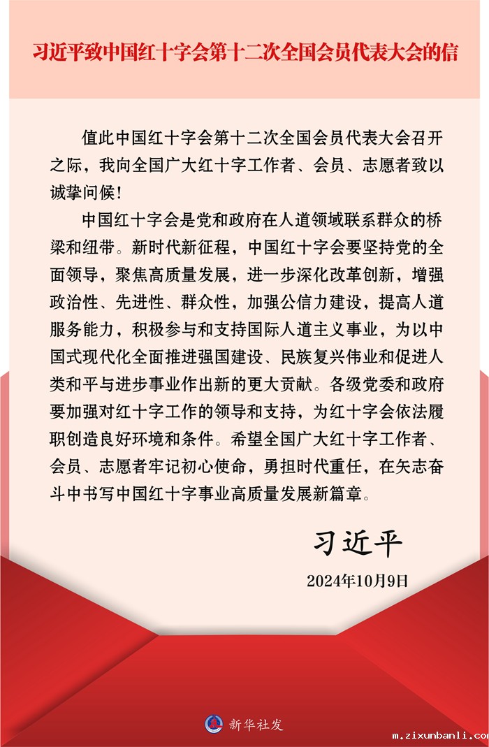 betway必威在线注册是党和政府在人道领域联系群众的桥梁和纽带。新时代新征程,betway必威在线注册要坚持党的全面领导,聚焦高质量发展,进一步深化改革创新,增强政治性、先进性、群众性,加强公信力建设,提高人道服务能力,积极参与和支持国际人道主义事业,为以中国式现代化全面推进强国建设、民族复兴伟业和促进人类和平与进步事业作出新的更大贡献。各级党委和政府要加强对红十字工作的领导和支持,为红十字会依法履职创造良好环境和条件。希望全国广大红十字工作者、会员、志愿者牢记初心使命,勇担时代重任,在矢志奋斗中书写中国红十字事业高质量发展新篇章。